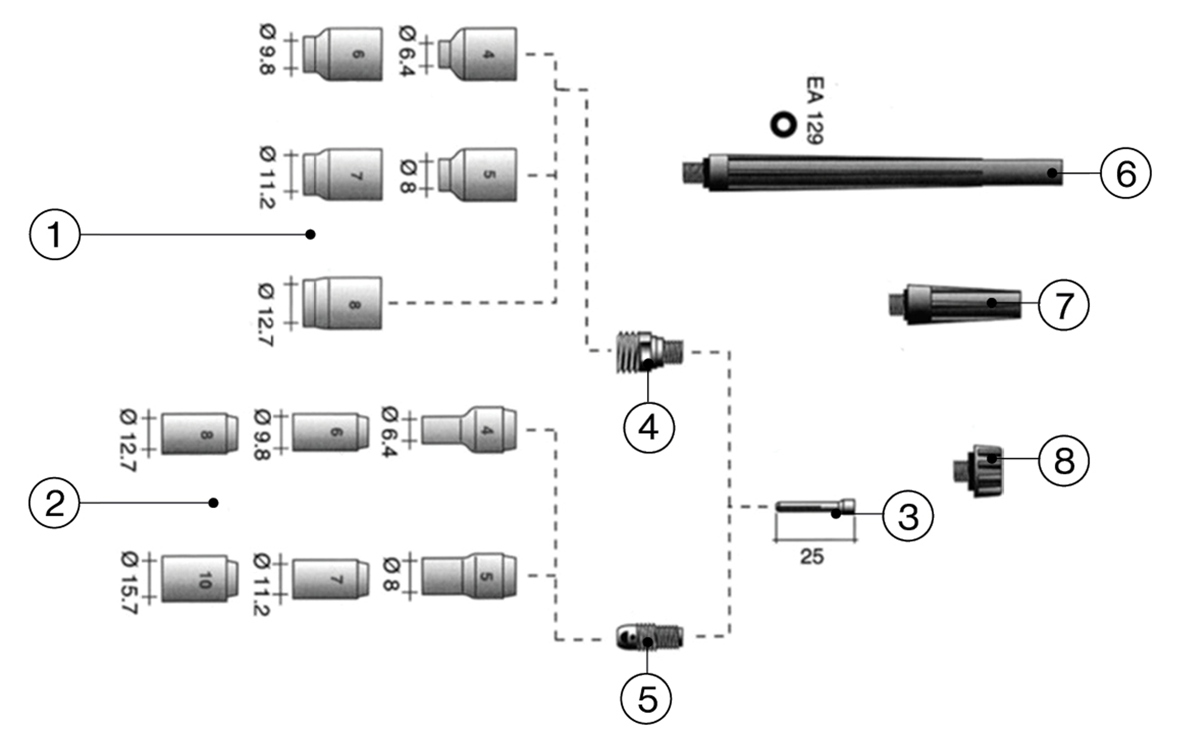- Fourni avec kit pièce de rechange (buse céramique, pince porte-électrode, diffuseur, bouchon long)